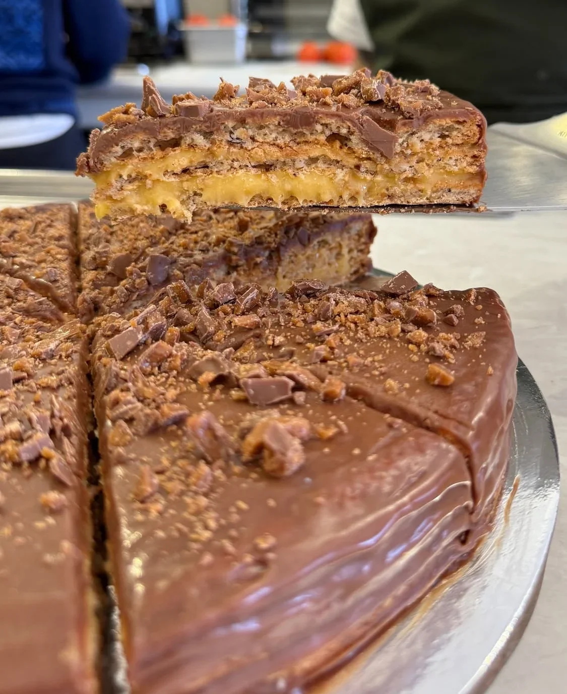 Layers of hazelnut meringue, 3-hr special sauce, milk chocolate ganache & crushed Daim chocolate.