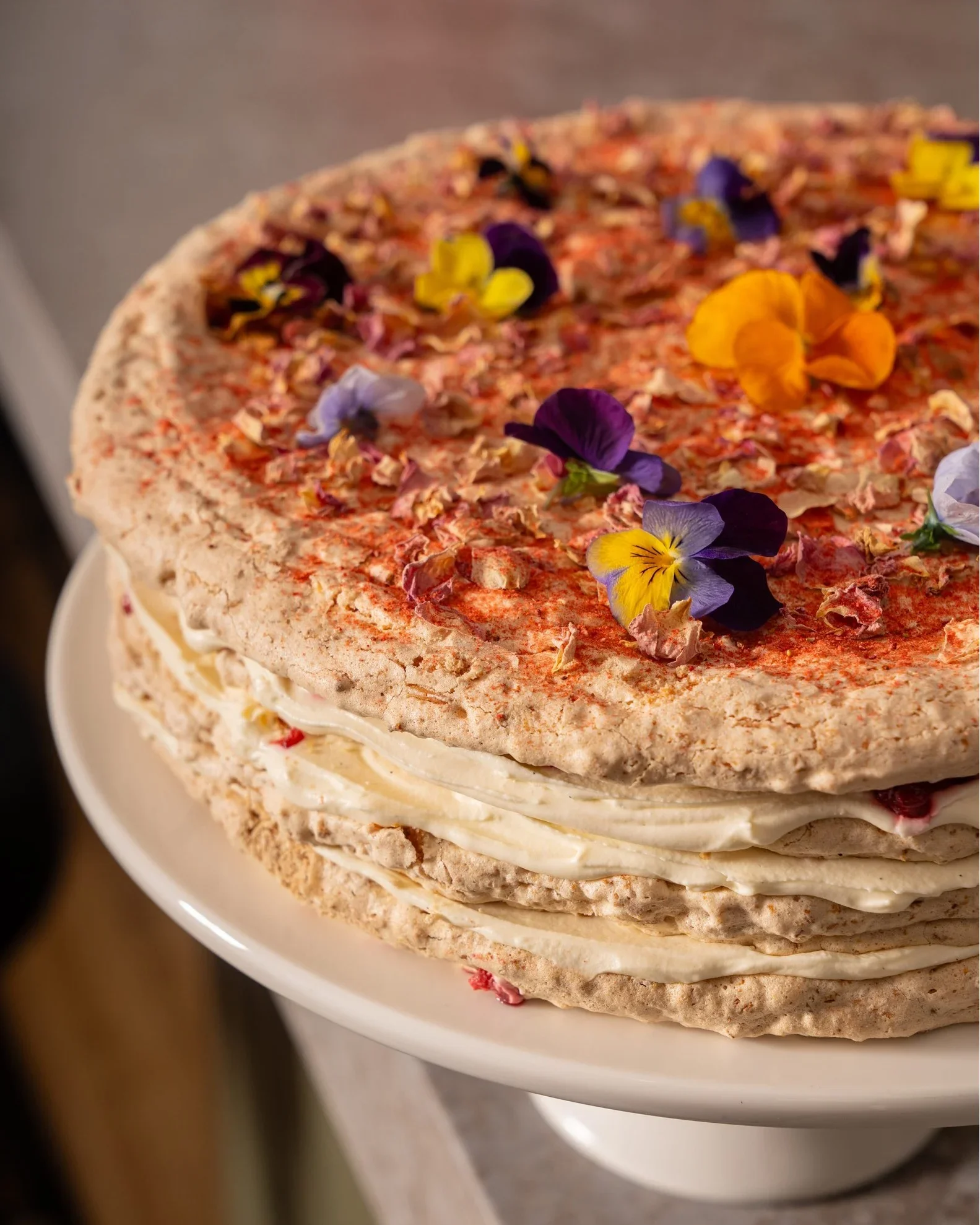 Layers of almond and coconut meringue with mascarpone cream, finished with a dusting of freeze-dried raspberries.